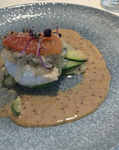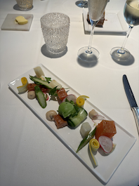 Le premier amuse-bouche consistait des dés de saumon norvégien saumuré et fumé à chaud au Jack Daniels. La texture fondante du saumon était sublimée par le fumet subtil du whisky, offrant une première bouchée d'une richesse surprenante. Les copeaux de crudités et les asperges blanches de Malines ajoutaient une note de fraîcheur croquante, tandis que la mayonnaise au café apportait une légère amertume, équilibrée par la douceur du sorbet au concombre, rafraîchissant et délicatement sucré. Ce plat était parfaitement accompagné d'un vin blanc italien, dont la minéralité et la fraîcheur soulignaient la complexité des saveurs sans les dominer.