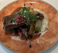Et la couronne d’agneau et ris croustillant, origine « Pays d’Oc ». La tendreté de l'agneau, relevée par le jus corsé et le fromage « Val-Dieu chèvre des moines », était un délice absolu. Les accompagnements – fenouil-poire-grenade et mousseline de chou-fleur et céleri boule – apportaient des nuances subtiles et sophistiquées. Les pois chiches frits ajoutaient une texture croquante, tandis que l’estragon apportait une touche d’herbacée qui rehaussait l'ensemble du plat.