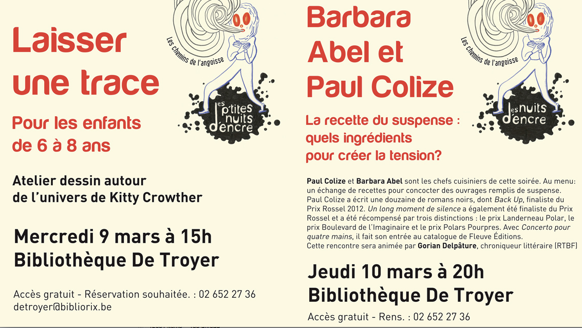 Barbara Abel explore les chemins de l’angoisse dans ses romans policiers, genre littéraire exigeant où elle s’illustre aux côtés de ses amis écrivains qui participent au festival. Kitty Crowther, auréolée en 2010 par le prestigieux prix Astrid Lindgren pour l’ensemble de son œuvre, raconte et illustre des histoires belles et étranges, dans des albums troublants que nos enfants adorent.