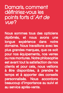 Si le point fort d’Art de vue réside dans le service et le rapport de confiance avec sa clientèle, il n’en reste pas moins vrai que vous y trouverez un choix incroyable dans les meilleures marques de montures optiques ou solaires, de lunettes adaptées au sport ou pour enfants et de verres correcteurs.