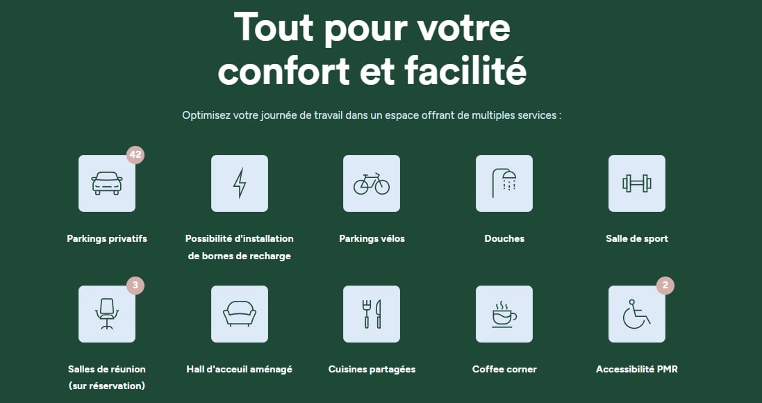 « Le bâtiment est équipé d'une connexion Wi-Fi haut débit, de salles de réunion, d’un coin cuisine, de photocopieurs, et même d’une salle de sport. Nos coworkers ont également accès à des parkings, notamment des bornes pour recharger les véhicules électriques », explique-t-il.