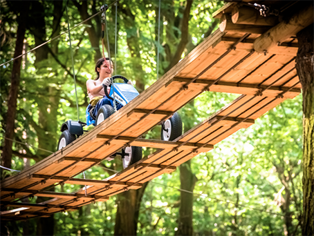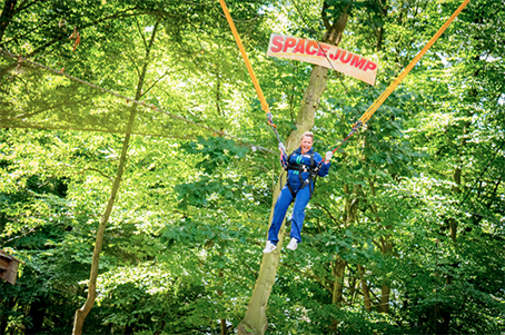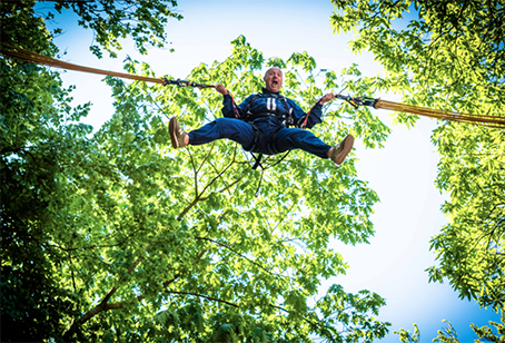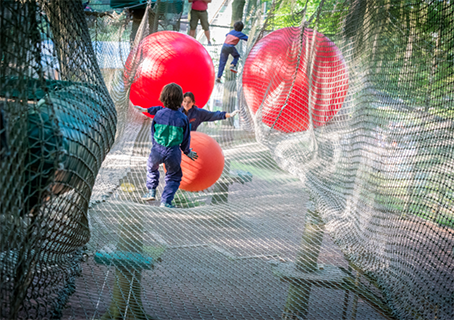 - 22 parcours et 220 jeux entre les arbres accessibles dès 5 ans : sauts de Tarzan, vélo, pas de géants, surf, cuistax… sécurisés par une ligne de vie continue et sans limite de temps.