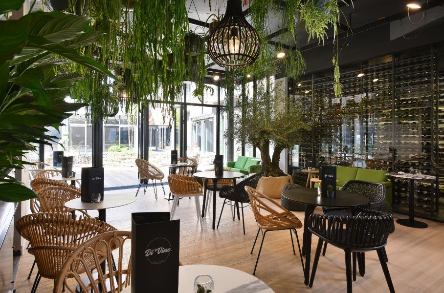 Le bar à vins Di’Vino a pris ses quartiers dans une orangerie lumineuse ouverte sur la cour paysagère et verdoyante du Resort.
