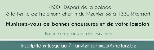 • du 7 au 9 janv. à Michel Dalet : 0478 07 83 26 ou micdalet@voo.be ;
