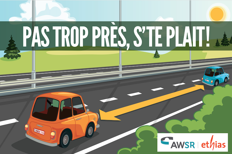 Les affiches de la campagne seront présentes durant tout le mois d’août sur les 300 panneaux qui bordent les autoroutes et routes régionales secondaires en Wallonie. Toutes les informations de la campagne ainsi que des conseils utiles pour calculer la distance de sécurité idéale sont disponibles sur le site de l’AWSR : www.awsr.be.