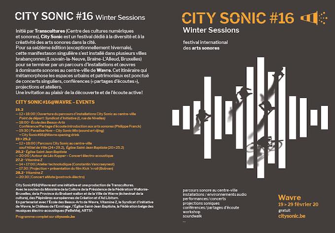 - 12h-18h : Parcours City Sonic au centre-ville sauf à l'Hôtel de ville (du 24 au 29/02) et à l'Église Saint-Jean-Baptiste (du 20 au 25/02)