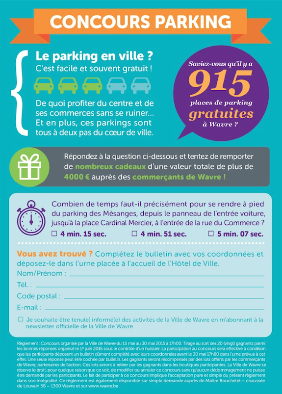« Nous souhaitions rendre évident, aux yeux des citoyens et des consommateurs du centre-ville, les avantages de se garer dans les parkings gratuits de la ville. Le temps de marche les séparant du cœur de ville était schématisé sur le flyer distribué à l’occasion du concours. C’est vraiment plus rapide qu’on ne le pense ! Il y a plus de 900 places de parking gratuit à Wavre. Rester garé en dehors du cœur de ville permet d’améliorer les flux de circulation qui sont parfois denses dans les rues commerçantes. De plus, les citoyens peuvent y voir l’occasion de faire de menues économies et quelques minutes de marche sont assurément bonnes pour la santé ! » déclare Monsieur Luc Gillard.