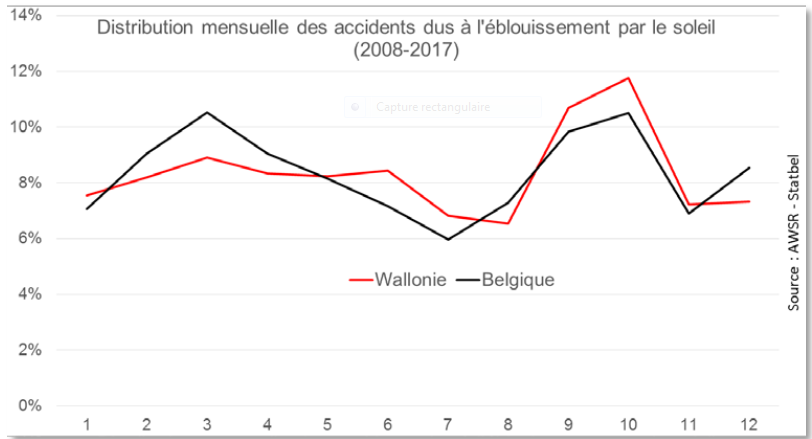 En 2017 en Wallonie, 138 accidents corporels sont survenus suite à un éblouissement par le soleil et 582 accidents au niveau national. 788 personnes ont été blessées des suites de ces accidents dont 199 en Wallonie et 16 personnes sont décédées dont 7 en Wallonie.