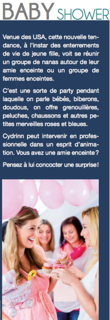 Avec toute la délicatesse dont elle est capable, Cydrinn peut alors les aider à y remédier. Elle aime aussi assister au moment de l’allaitement ou du biberon a n de pouvoir conseiller au mieux la jeune maman en- core inexpérimentée.