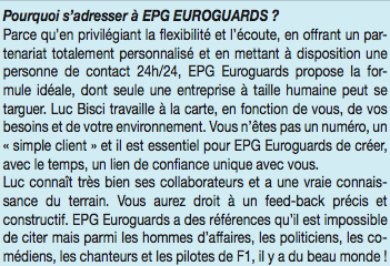 Pour Luc Bisci, un agent est là avant tout pour accueillir et sécuriser un lieu ou une personne et jamais pour rouler des mécaniques. « Il n’est pas La personne importante. Je veille à ce que mes collaborateurs aient le sens du « quant à soi ». Être là mais ne pas gêner. Et il ne faut pas se leurrer, ce job, c’est 95% d’attente, 4% de discussion et 1% d’action » souligne le fondateur d’EPG Euroguards. Les agents de gardiennage ont une ouïe toujours en alerte et un sens de l’observation aiguisé. Ils doivent être capables de constater des choses anormales dans un contexte normal, des choses qui paraîtront sans doute anodines aux yeux de Mr et Mme Tout-le-monde.