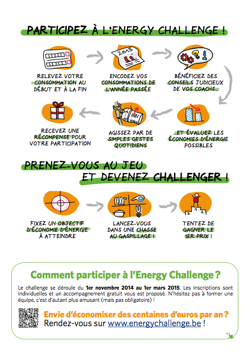 L’Energy Challenge encourage les citoyens à poser les gestes utiles pour économiser de l’énergie. Cette initiative est organisée par plusieurs associations (Objectif 2050, Inter-Environnement Wallonie, écoconso, APERe) et la société EcoRes. Elle est menée en étroite collaboration avec Le Soir, et soutenue par la Loterie Nationale et l’Alliance Emploi-Environnement (SPW).