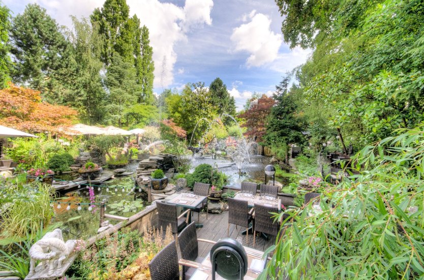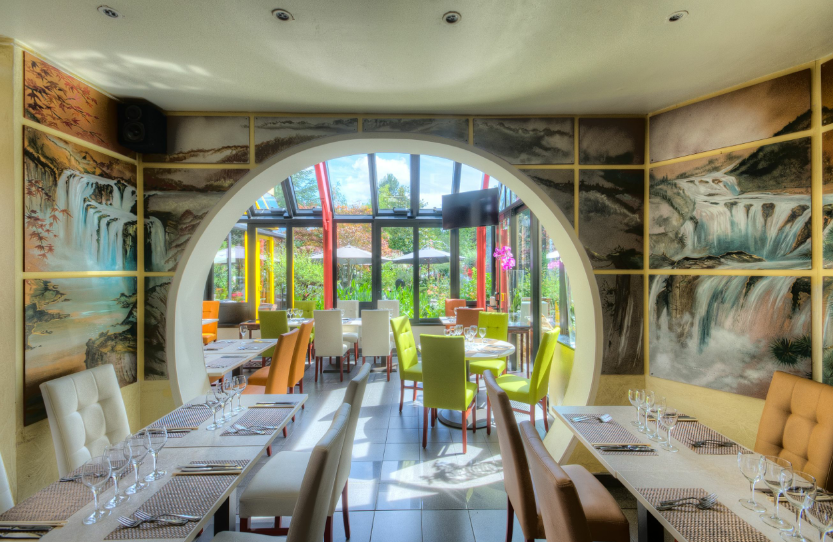 Sur le site d’une ancienne maison de repos est alors adapté un imposant bâtiment entièrement construit sur les principes du Feng Shui. Les éléments les plus marquants de celui-ci son incontestablement l’immense verrière, l’incroyable plan d’eau où nagent paisiblement d’immenses kois ainsi qu’un jardin rempli de sculptures qui transportent immédiatement les hôtes à des milliers de kilomètres de la Belgique.