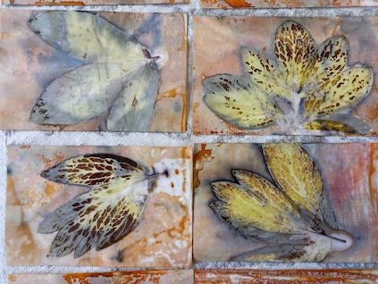 Le « Tataki-Zome » est un art ancestral japonais que je découvre en 2015. Cette autre forme de gravure consiste à teindre des tissus avec des sucs de plantes, sans encre. C’est une nouvelle porte d’exploration qui m’invite à être attentive au monde végétal qui m’entoure. Je respire, je touche, je choisis les plantes qui céderont leur tanin, je travaille à l’air libre… je suis libre.