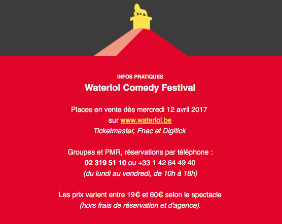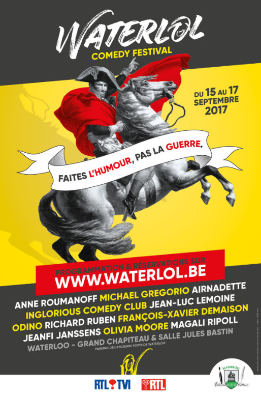 | Au coeur de Waterloo! Soutenu par la commune de Waterloo, le festival installera son chapiteau de 1600 places en plein coeur de la ville et proposera également des spectacles plus intimistes dans la salle communale Jules Bastin de 250 places. Comme l’explique l’échevin de la Culture Yves Vander Cruysen, « la ville de Waterloo souhaite proposer des grands évènements de qualité au public de la région. La bourgmestre Florence Reuter et moi-même avons cette même volonté : développer l’offre culturelle et perpétuer la dynamique positive qui fait la renommée de Waterloo. » Le rendez-vous est fixé. Gérard Pullicino et son équipe vous attendent du 15 au 17 septembre 2017 à Waterloo pour la première édition du festival Waterlol qui souhaite rassembler toutes les générations autour d’un dénominateur commun : le rire sous toutes ses formes! |