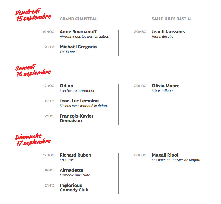 Le public pourra notamment y applaudir Anne Roumanoff, Michaël Gregorio, François-Xavier Demaison, Jean-Luc Lemoine, Jeanfi Janseens, Richard Ruben, Alex Vizorek ou encore la comédie musiculte Airnadette et Isabelle Vitari