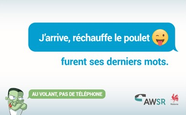 L’affiche de la campagne sera présente pendant tout le mois d’octobre le long des autoroutes et routes secondaires en Wallonie. Avec une pointe de cynisme, elle rebondit sur les résultats de l’enquête et rappelle qu’on utilise souvent son téléphone au volant pour communiquer des banalités qui auraient pu être postposées alors que les risques, eux, ne peuvent pas être évités.