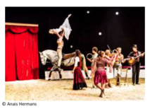 Mêlant les arts équestres, le théâtre et le cirque, ce cabaret de 60 minutes met en scène une dizaine de voltigeurs-musiciens et 4 chevaux. La percussion de ferme, la douce mélodie du violon et le rythme de la guitare se mêlent aux foulées du galop et au ballet aérien du voltigeur. L’acrobate s’élance, le porteur est tantôt cheval, tantôt humain, dans un jeu complice et espiègle.