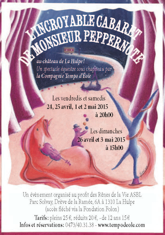 La compagnie de cirque équestre Tempo d’Eole, et le centre d’hippothérapie, d’équitation adaptée, et poney- club Les Rênes de la Vie s’associent pour organiser un événement culturel et équestre exceptionnel destiné au grand public avec 6 soirées spectacle de L’incroyable Cabaret de Monsieur Peppernote sous chapiteau, dans le parc du Château de La Hulpe.