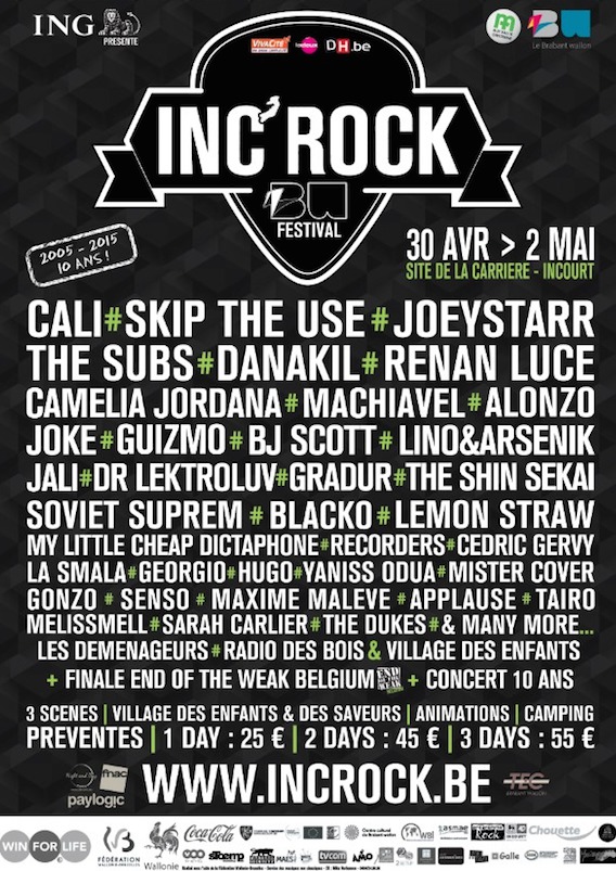 L’an dernier, l’Inc’Rock avait proposé une journée spéciale pour les enfants le samedi. Fort du grand succès de cette initiative, elle sera reconduite le samedi 2 mai avec l’aide des Mutualités chrétiennes en proposant un village des enfants spécifiquement encadré par des animateurs brevetés. Les célèbres DEMENAGEURS viendront nous gratifier d’un concert dont ils ont le secret tandis que les animations seront à nouveau très nombreuses durant tout l’après-midi. Les concerts et toutes les animations du samedi seront accessibles aux moins de 12 ans pour le prix de 5 € (gratuit pour les 0-3 ans).