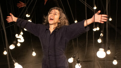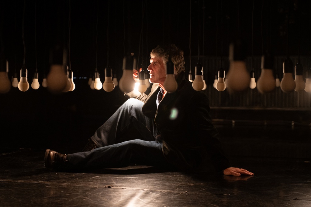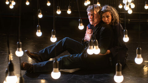 Sur une scène quadrillée d’ampoules suspendues, un comédien et une danseuse racontent cette histoire, où chaque mouvement, chaque geste et chaque regard compte.