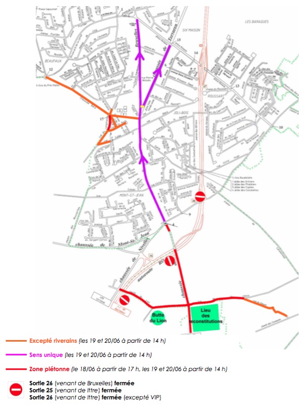 La N5 (chaussée de Bruxelles-chaussée de Charleroi) sera totalement fermée à la circulation depuis le rond-point du Château Cheval (dit de l'ancien Bigg's – croise- ment avec la chaussée de Louvain et la chaussée de Nivelles) jusqu'au chemin de la Belle Alliance à Plancenoit.