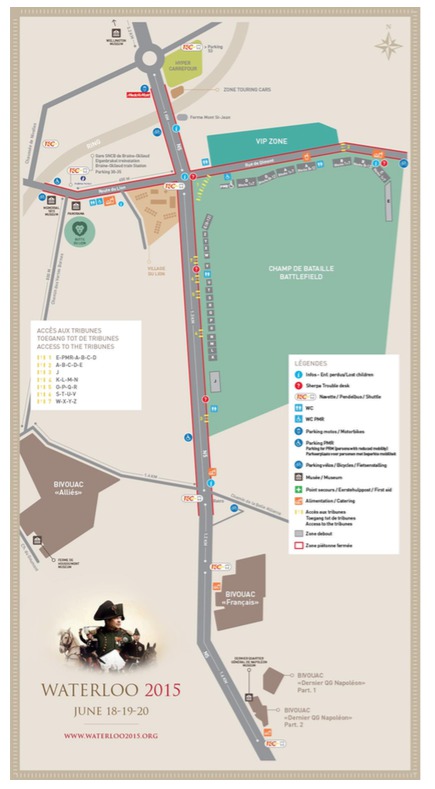 - À votre arrivée (ou mieux, avant de venir), repérez sur le plan l'emplacement des lieux que vous souhaitez visiter, l'entrée de la tribune pour laquelle vous avez des places, mais aussi les toilettes, les postes de secours et le commissariat de police mobile. Ce dernier sera installé le long de la route du Lion, en face du Centre du Visiteur et de la Butte du Lion. Le plan peut être téléchargé sur www.waterloo2015.org.