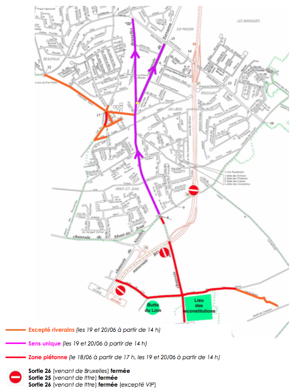 Sur le Ring 0, les sorties 25 (Butte du Lion) et 26 (Genappe) en venant de Ittre se- ront fermées. En venant de Bruxelles, la sortie 26 (Mont-Saint-Jean) vers la chaussée de Louvain sera également fermée.