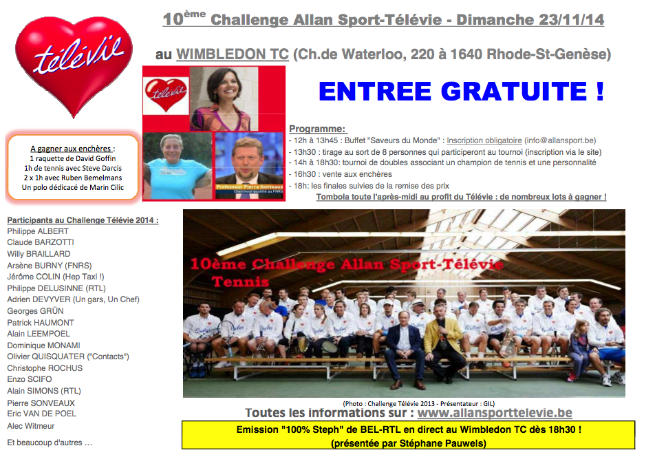Partagez aussi notre page facebook "Tennis televie - Site officiel" : [https://www.facebook.com/tennistelevie?ref=bookmarks]url: (merci de cliquer "j'aime" sur la page) et d'inviter vos amis à l'événement qui a été créé sur cette page facebook !