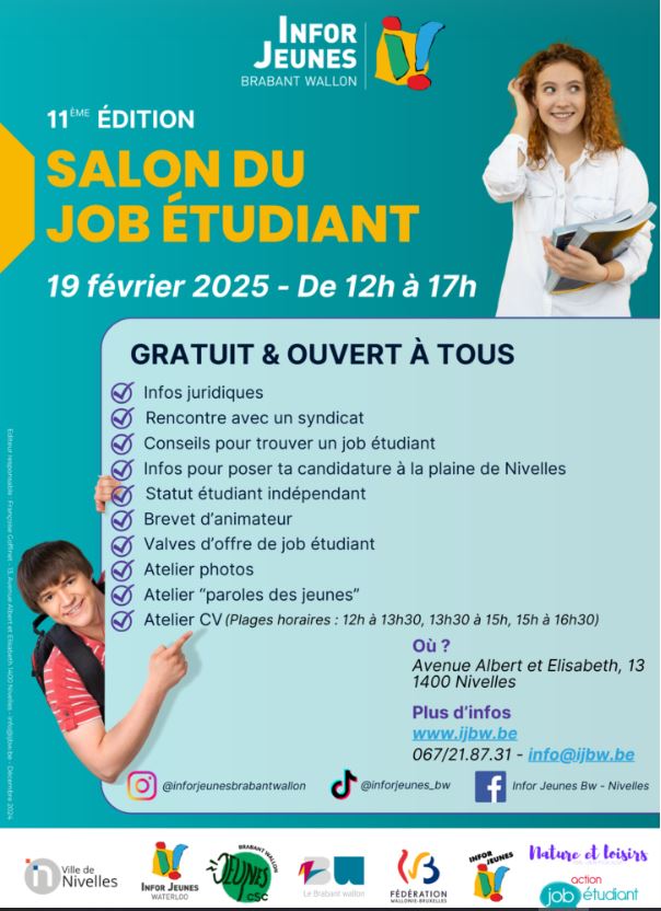 La 11ᵉ édition du Salon du Job Étudiant se tiendra le mercredi 19 février 2025, de 12h00 à 17h00, au 13, Avenue Albert et Élisabeth à Nivelles. Cet événement gratuit et ouvert à tous est une occasion unique pour les étudiants de rencontrer divers acteurs du monde professionnel et de l'information jeunesse.