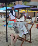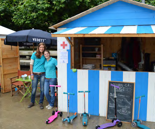 Nous avons décidé cette année de sacrifier le ter- rain de beach-volley, qui selon nous était sous-utilisé, afin d’offrir un espace d’accueil et un nombre de transats en suffisance, et que tout le monde puisse trouver une place sur le sable, surtout lors des très beaux jours. 125 transats et 20 transats pour les plus petits seront donc disponibles, ainsi que 4 hamacs. Toutefois, il n’est pas improbable que le terrain de beach-volley refasse l’une ou l’autre apparition sur simple demande.