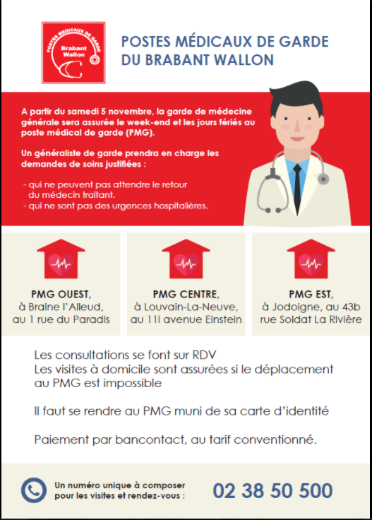 Depuis le 5 novembre 2016, la garde de médecine générale de la plupart des communes brabançonnes s’effectue le weekend et jours fériés au Poste Médical de Garde (PMG) du Brabant wallon, le week-end et les jours fériés.