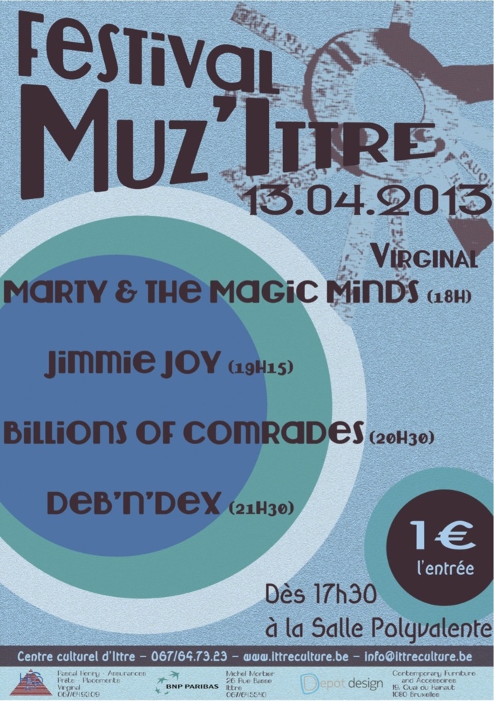Dès 18h, le groupe Marty and the Magic Minds ouvrira le bal. Le groupe est créé en septembre 2010 par Sasha Vovk, Martin Seghers, Louis de Fauconval et Kévin Aubry. En 2012, ils enregistrent leur premier CD 5 titres. Ces quatre passionnés ont tous étudié la musique (le jazz, principalement), que ce soit au Conservatoire de Bruxelles ou à la JazzBXLSchool. Les Marty and the Magic Minds viendront présenter leurs mélodies envoutantes sur la scène du Muz’Ittre. (http://www.martyandthemagicminds.be/)