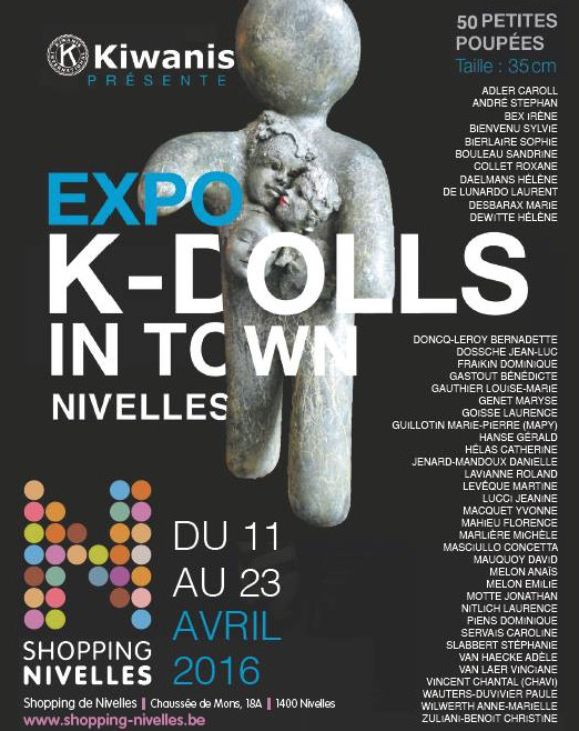Du 11 au 23 avril 2016, le Kiwanis Nivelles Brabant Wallon organise l'exposition K-Dolls avec les poupées Kiwanis décorées par de nombreux artistes au Shopping Center de Nivelles. Les poupées de 35 cm seront proposées à la vente et les personnes désireuses d'acquérir ces poupées pourront s'inscrire sur une liste en faisant une offre, la mise de départ étant de 250€. La vente aux enchères privée sera clôturée le 23 avril 2016 à 19h00. Les fonds récoltés lors de la vente iront soutenir nos projets au bénéfice des enfants hospitalisés de Belgique et du Luxembourg.