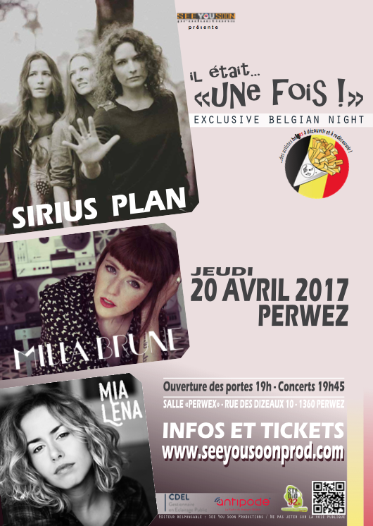Une programmation variée et de qualité dans une salle flambant neuve ! Tous les éléments sont réunis pour passer une magnifique soirée avec des artistes féminines de talent qui nous font l'honneur de venir enchanter nos oreilles pour cette première édition : SIRIUS PLAN (dont Gaëlle est namuroise) / MILLA BRUNE (bruxelloise) / MIA LENA (bruxelloise) ! A titre indicatif, le prix du ticket est seulement à 17,50€ (frais de réservation inclus).
