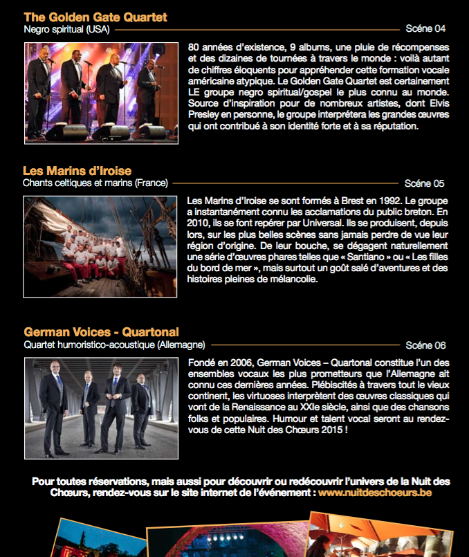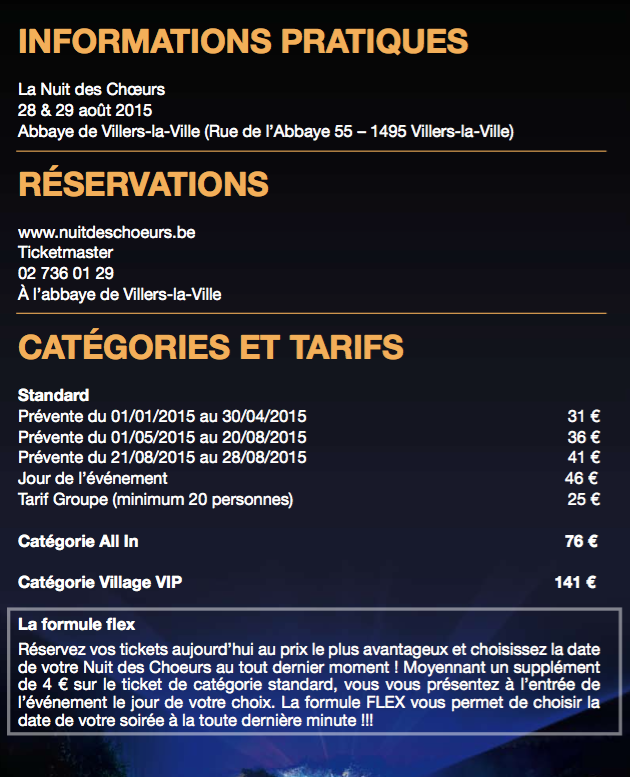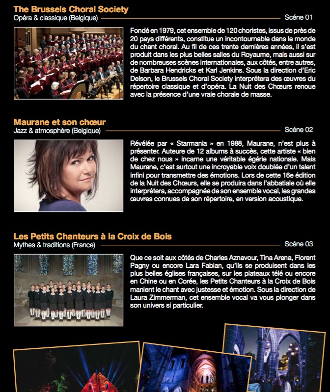 | Ces 28 et 29 août, l’abbaye de Villers-la-Ville constituera, à nouveau, le somptueux décor de cette 16e édition de la Nuit des Chœurs. Le plus grand concert-promenade du Royaume accueillera six formations vocales de divers horizons, tant géographiques que musicaux. L’éclectisme et la magie sont au rendez-vous. Présents dans les endroits les plus remarquables du site historique, les artistes répètent leur concert de 20 minutes tout au long de la soirée. Les horaires des concerts permettent aux spectateurs de découvrir, à leur rythme, les divers ensembles vocaux, au détour d’un pan de muraille ou sous les voûtes séculaires d’une crypte, tout en profitant des espaces de repos et de restauration. En fin de soirée, tous les artistes se rassemblent sur la grande scène pour une apothéose émouvante rehaussée d’un feu d’artifice prestigieux ! |