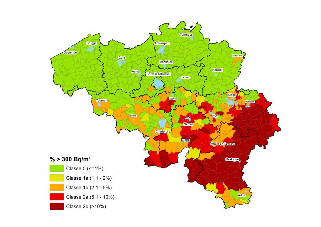 Les communes de Rebecq, Tubize, Nivelles, Waterloo, Lasne, La Hulpe, Rixensart, Wavre, Beauvechain, Jodoigne, Perwez et Orp-Jauche sont classées au niveau 1 (1 à 5 % des mesures sont supérieures à 300 Bq/m3).