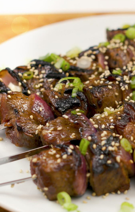 - Préparez un barbecue ou préchauffez la grille de cuisson à feu moyen-vif. Piquez la viande et l’oignon rouge sur les brochettes.