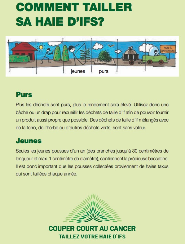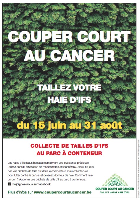 Mobilisez-vous ! En collaboration avec votre Commune et l’Intercommunale du Brabant wallon (IBW), aidez-nous à lutter contre le cancer. La seule chose que vous avez à faire est de tailler votre haie ou votre buisson d’ifs entre le 15 juin et le 31 août et faire don de vos tailles au parc à conteneurs !