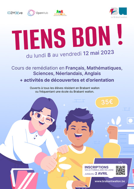 « Tiens Bon ! » se déroulera pendant la deuxième semaine des vacances de printemps. Les cours de remédiation sont ouverts aux élèves de 6e primaire et du secondaire, tous réseaux confondus, pour peu qu’ils fréquentent une école du Brabant wallon ou qu’ils résident dans la province. Les activités de l’après-midi sont réservées aux élèves de 6e primaire à la 3e secondaire. « Ces activités contribueront la démarche d’orientation des jeunes. En effet, la 3ième année devient avec les réformes actuelles de l’enseignement, une année charnière en termes d’orientation ».