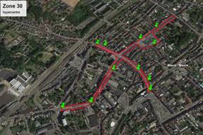 La zone 30 retenue se limite à l’hypercentre et concerne la rue du Chemin de Fer, la rue du Pont du Christ, la rue de Nivelles et la rue Haute, ainsi que la place Cardinal Mercier et la rue de Bruxelles.