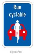 La rue cyclable est une disposition du code de la route où la vitesse est limitée à 30km/h mais où, en plus, le comportement des véhicules motorisés est subordonné à celui des cyclistes.