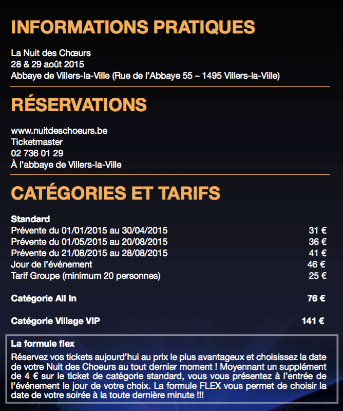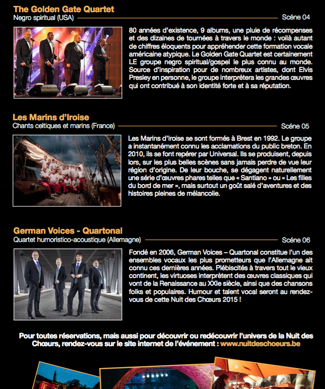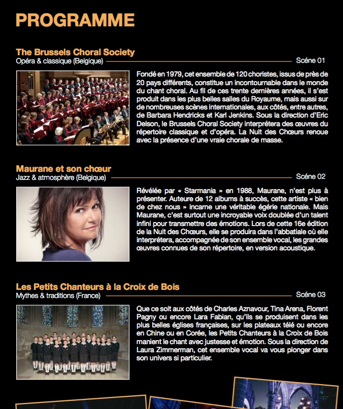 | Ces 28 et 29 août, l’abbaye de Villers-la-Ville constituera, à nouveau, le somptueux décor de cette 16e édition de la Nuit des Chœurs. Le plus grand concert-promenade du Royaume accueillera six formations vocales de divers horizons, tant géographiques que musicaux. L’éclectisme et la magie sont au rendez-vous. Présents dans les endroits les plus remarquables du site historique, les artistes répètent leur concert de 20 minutes tout au long de la soirée. Les horaires des concerts permettent aux spectateurs de découvrir, à leur rythme, les divers ensembles vocaux, au détour d’un pan de muraille ou sous les voûtes séculaires d’une crypte, tout en profitant des espaces de repos et de restauration. En fin de soirée, tous les artistes se rassemblent sur la grande scène pour une |