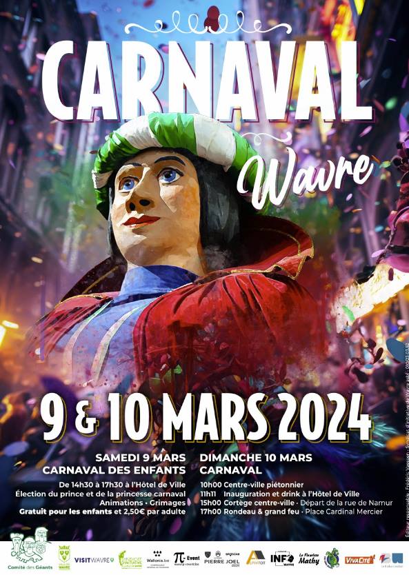 Le 10 mars à partir de 10h, l'hôtel de Ville et les rues du centre de Wavre s'animeront pour le Carnaval et le Grand Feu. Une journée exceptionnelle vous attend, rythmée par les défilés de chars, les costumes extravagants et les danses endiablées.