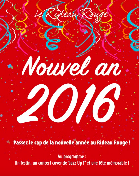 Les mots d'ordre sont : repas de fête, boissons à a volonté" et musique live avec le cover band JazzUp ! En bref, une formule "ALL IN" pour festoyer comme il se doit en compagnie de l'équipe du rideau rouge !
