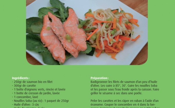 Ingrédients : - 250gr de saumon bio en filet - 300gr de carotte - 1 botte d’oignons verts, rincée et lavée - 1 botte de cresson de jardin, lavée - 1 concombre, lavé - Nouilles Soba (au riz) : 1...