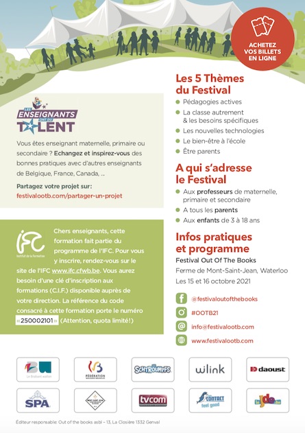En complémentarité du Festival, l’ASBL « Out of the books » propose des journées inspirantes de formation pour parents et professionnels de l’éducation ainsi que l’animation de notre page Facebook grâce, entre autre, aux Lives d’interviews d’experts diffusés gratuitement depuis le 1er confinement (mars 2020) à raison d’un Live par semaine www.facebook.com/festivaloutofthebooks