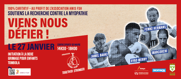 Une opportunité rare de montrer vos compétences, de ressentir l'adrénaline du ring, et surtout, de soutenir une cause qui touche de nombreuses vies. Chaque participation compte, chaque coup porté est un pas de plus vers la recherche médicale et l'espoir de trouver des traitements contre la Myopathie.